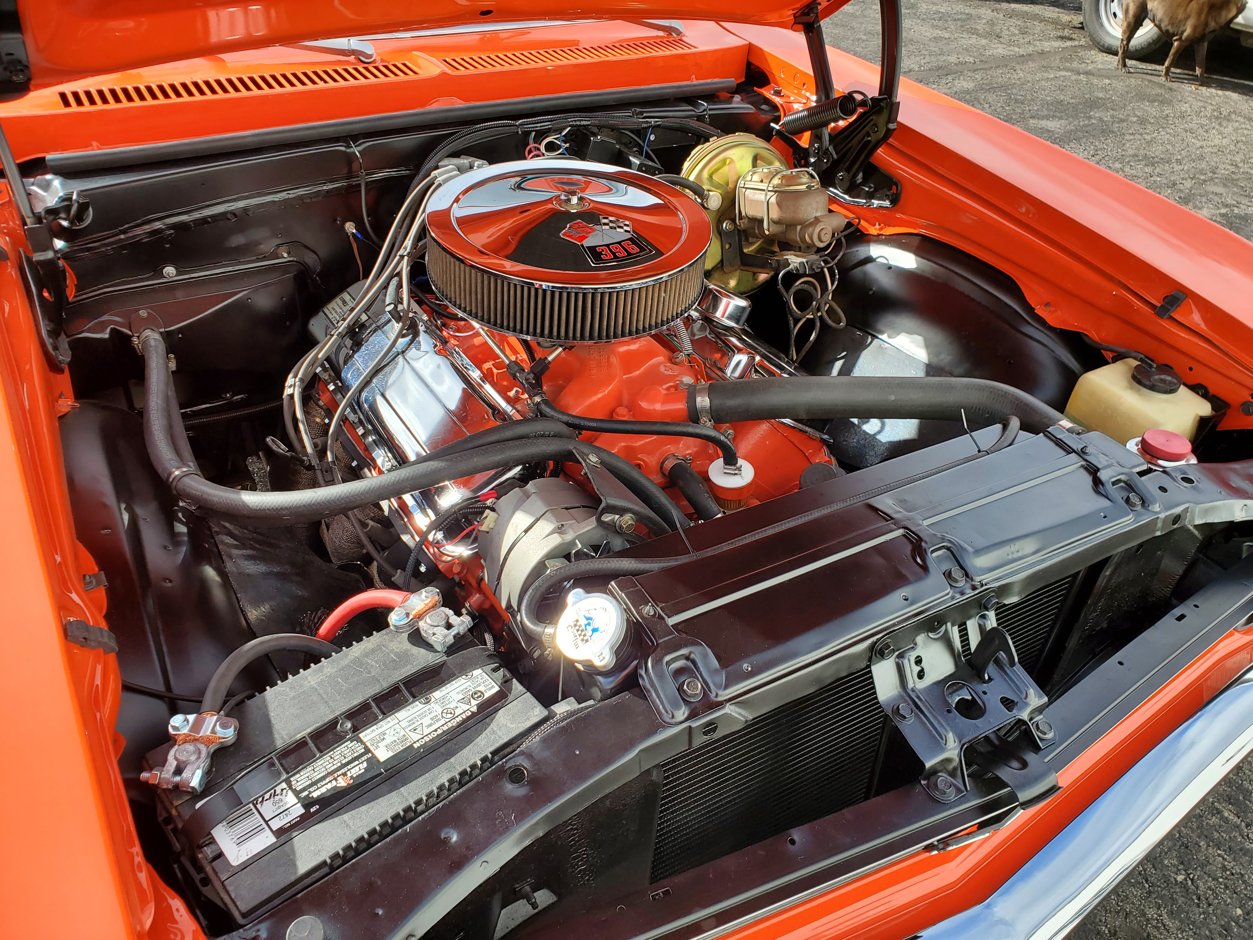 | Hugger Orange with black racing stripes do this Big Block SS Nova justice. |